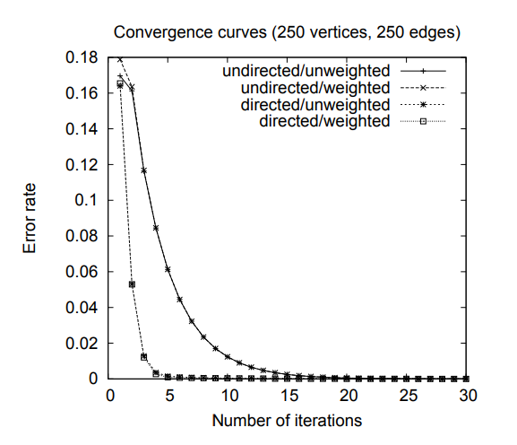 图 1:基于图的排序的收敛曲线:有向 / 无向图,有权 / 无权图,250 个顶点,250 条边。